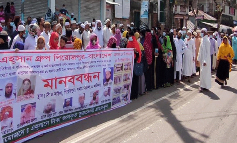পিরোজপুর, ২৭ সেপ্টেম্বর – ‘বিনিয়োগ করলে বেহেশত, ইহকালে দ্বিগুণ লাভ, পরকালে মুক্তি’ এমন সব চটকদার কথা বলে পিরোজপুর ও আশপাশের এলাকার ধর্মপ্রাণ মানুষকে আকৃষ্ট করতে থাকে এহসান গ্রুপ। তাদের প্রতারণার ফাঁদে পড়ে হাজার হাজার মানুষ বিনিয়োগ করতে থাকেন গ্রুপটিতে। বিনিয়োগের অংক ও গতি বাড়াতে এহসান গ্রুপ ব্যবহার করে ধর্মীয় বক্তা, মসজিদের ইমাম ও খাদেমদের মতো ব্যক্তিদেরও। ধর্মীয় ব্যক্তিত্ব পরিচয়ে অনেকের নানান প্রকারের বক্তব্যে মানুষ আরও টাকা ঢালতে থাকে এহসান গ্রুপে। কিন্তু সময় গড়ানোর সঙ্গে সঙ্গে ধর্মপ্রাণ মানুষ বুঝতে পারেন, তারা প্রতারিত হচ্ছেন। এখন অনেক কষ্টের বিনিয়োগ হারিয়ে তারা ঘুরছেন দ্বারে দ্বারে। সম্প্রতি গ্রুপটির প্রতারণা-জালিয়াতি ধরা পড়েছে আইনশৃঙ্খলা বাহিনীর হাতে।