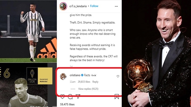 মঙ্গলবার রাতে ইন্সটাগ্রামে করা এই পোস্টে লাইক দিয়েছেন রোনালদো নিজেই। পাশাপাশি মন্তব্যের ঘরে তিনি পর্তুগিজ ভাষায় লিখেছেন, ‘Factos’ যার অর্থ হলো ‘এটিই তথ্য’। অর্থাৎ লুকাস মেন্ডেসের করা সেই পোস্টের সঙ্গে একমত রোনালদো এবং তিনিও মনে করেন এবারের ব্যালন ডি অর ছিল সরাসরি চুরি।