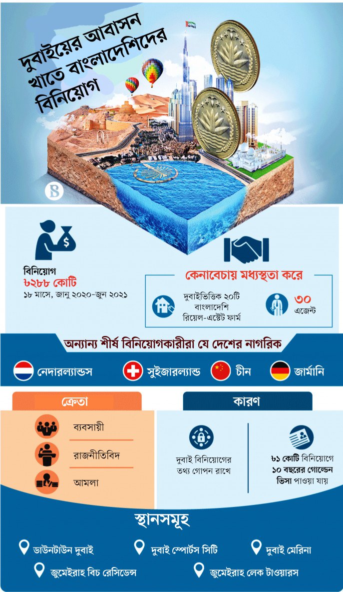 ঢাকা, ০৯ ফেব্রুয়ারি – কোভিড মহামারির ১৮ মাসে দুবাইতে রিয়েল-এস্টেট এবং আবাসনে বিনিয়োগের শীর্ষে রয়েছে বাংলাদেশি নাগরিকরা। যদিও দুবাই বিলাসবহুল শপিংমল, অতি-আধুনিক স্থাপত্য এবং প্রাণবন্ত নৈশকালীন আমোদ-প্রমোদের শহর হিসেবেই পরিচিত। এদেশের নাগরিকদের বিনিয়োগের তথ্য দুবাইয়ের সরকারি নথি এবং সেই সূত্রে প্রকাশিত স্থানীয় সংবাদপত্রের বরাতেই জানা গেছে।