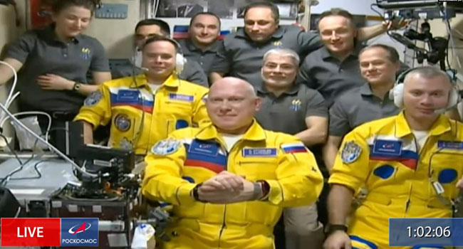 মস্কো, ২০ মার্চ – ইউক্রেনের পতাকার রঙে পোশাক পরে আন্তর্জাতিক মহাকাশ স্টেশনে হাজির হয়েছেন ৩ রুশ নভোচারী।