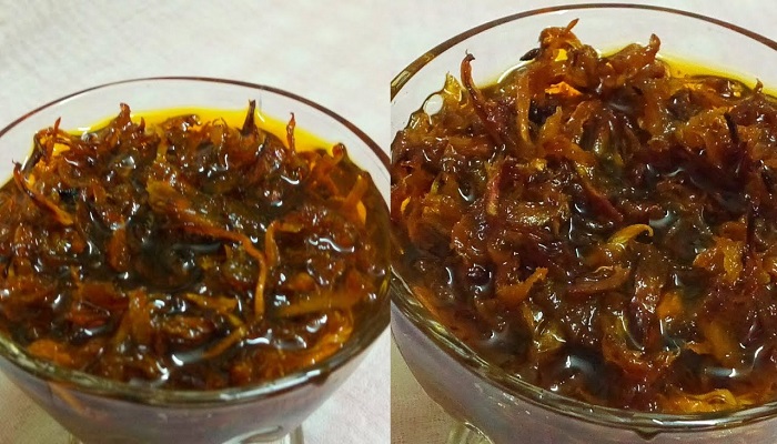 সুগন্ধ বের হলে আঁচ থেকে নামিয়ে গরম তেলটা আমের আচারের ওপর ঢেলে দিন। তৈরি আমের ঝুরি আচার।
