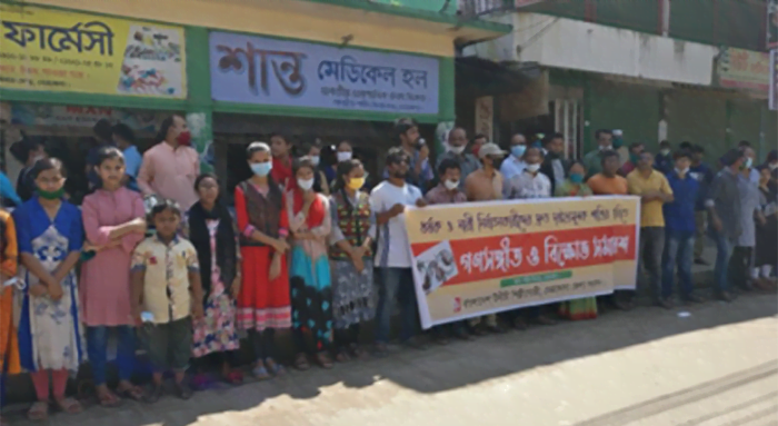 বেলা ১১ টায় নেত্রকোনা শহরের ছোটবাজার শহীদ মিনার মোড় থেকে মোক্তারপাড়া সড়কে প্রতিবাদী গণসংগীত পরিবেশনের মধ্য দিয়ে তারা বিক্ষোভ সমাবেশ করেন।