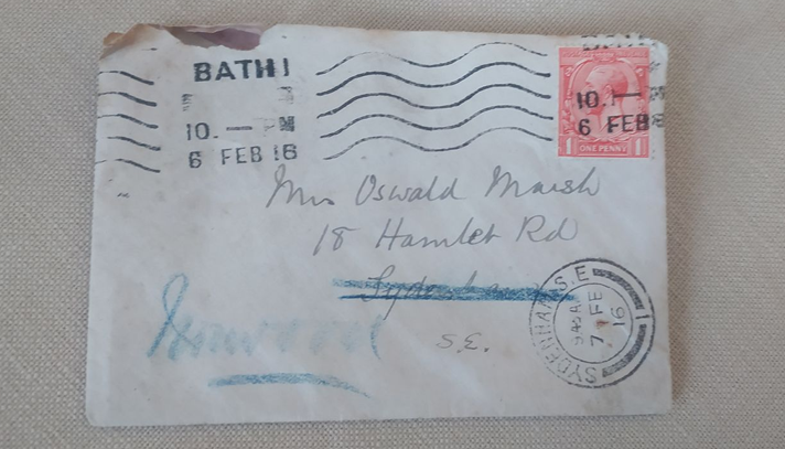 চিঠিটি যে খামে রয়েছে, সেখানে এক পেন্সের (যুক্তরাজ্যের মুদ্রা) একটি স্ট্যাম্প রয়েছে। ওই স্ট্যাম্পে কিং জর্জের ছবি রয়েছে। চিঠিটি প্রথম বিশ্বযুদ্ধের সময়ে লেখা হয়েছিল, প্রয়াত রানি দ্বিতীয় এলিজাবেথের জন্মের আগে।