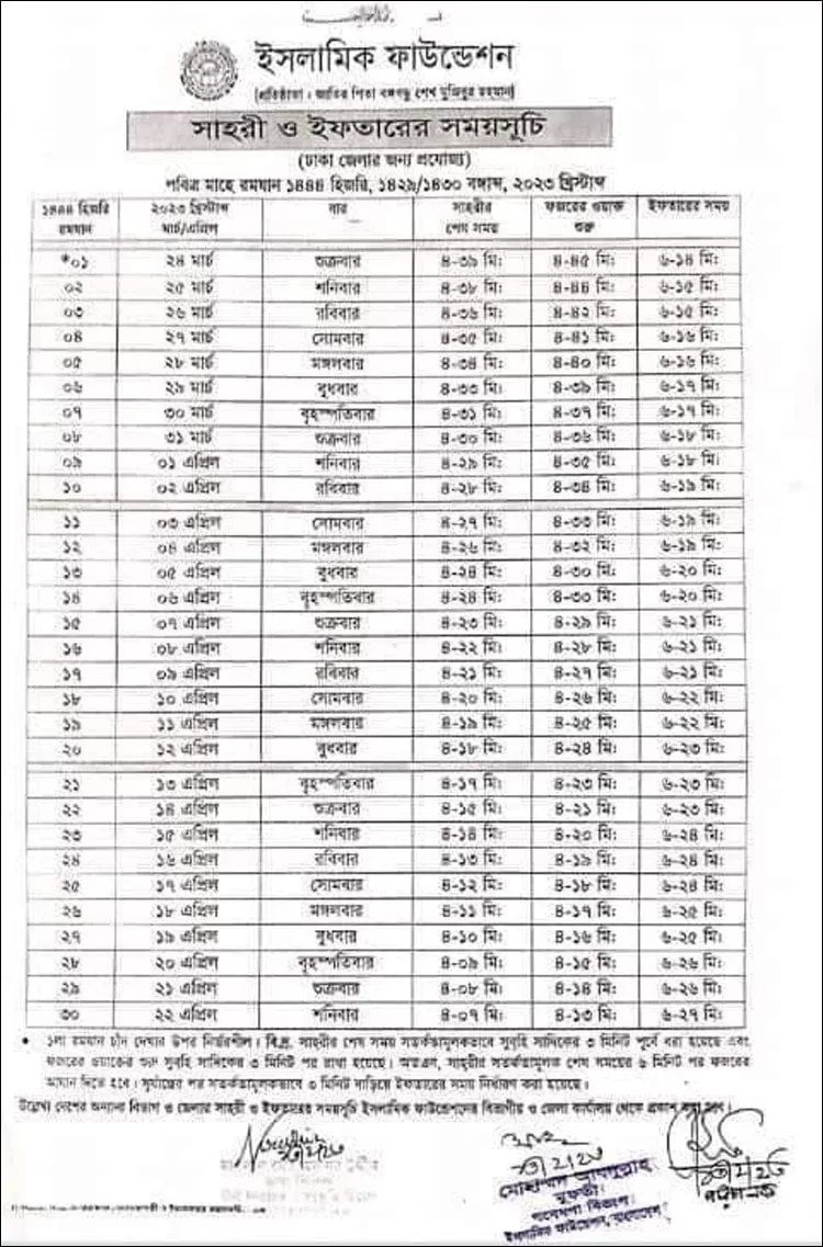 ২৪ মার্চ রমজান মাস শুরুর তারিখ ধরে সেহরি ও ইফতারের সময়সূচি চূড়ান্ত করেছে ইসলামিক ফাউন্ডেশন।