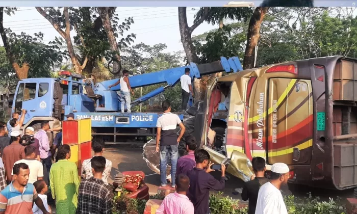 হঠাৎ ঝড়ো হাওয়ায় সড়কে উল্টে গেল বাস, আহত ১৮ যাত্রী