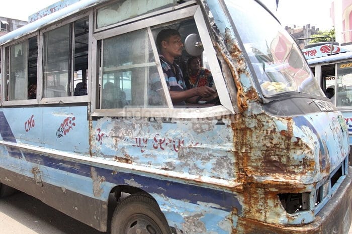 গত তিন দিনে গুলিস্তান, যাত্রাবাড়ী, মিরপুর ও গাবতলী রুটে সরেজমিন এমনই দৃশ্য চোখে পড়ে। লোকাল সার্ভিস, সিটিং সার্ভিস এমনকি টিকিট সার্ভিসের গাড়িরও একই হাল। গাবতলী থেকে যাত্রাবাড়ী ও সদরঘাট রুটে চলা ‘৮’ ও ‘৭’ নম্বরের অধিকাংশ বাসেই দেখা যায় কোনোটির গ্লাস ভাঙা, কোনোটির লুকিং গ্লাসই নেই, কোনোটির সামনে ও পেছনের বাম্পার খোলা। কোনোটির জানালার কাচ অর্ধভাঙা হয়ে ঝুলছে, কোনো কোনোটির আবার বডি দোমড়ানো-মোচড়ানো। আবার কোনো কোনো গাড়ি ভাঙাচোরা না হলেও রাস্তায় চলার সময় অন্য গাড়ির সঙ্গে ঘষাঘষির কারণে দু-তিন মাসের মধ্যেই রং উঠে কদাকার। রাজধানীর মৌচাক মোড়ে যানজটে আটকে থাকা এ রকম একাধিক বাস চোখে পড়ে। টঙ্গী-গাজীপুর থেকে উত্তরা হয়ে চলা তুরাগ, ভিআইপি, ছালছাবিল, অনাবিলসহ প্রায় সব কটি পরিবহন কোম্পানির বাস রংচটা, বিবর্ণ ও আঁচড় লাগানো। মিরপুর থেকে চলাচলকারী দিশারি, নিউ ভিশন, বিকল্প, হিমালয়, মিরপুর পরিবহনসহ সব কটি বাসেরই বেহাল দশা।