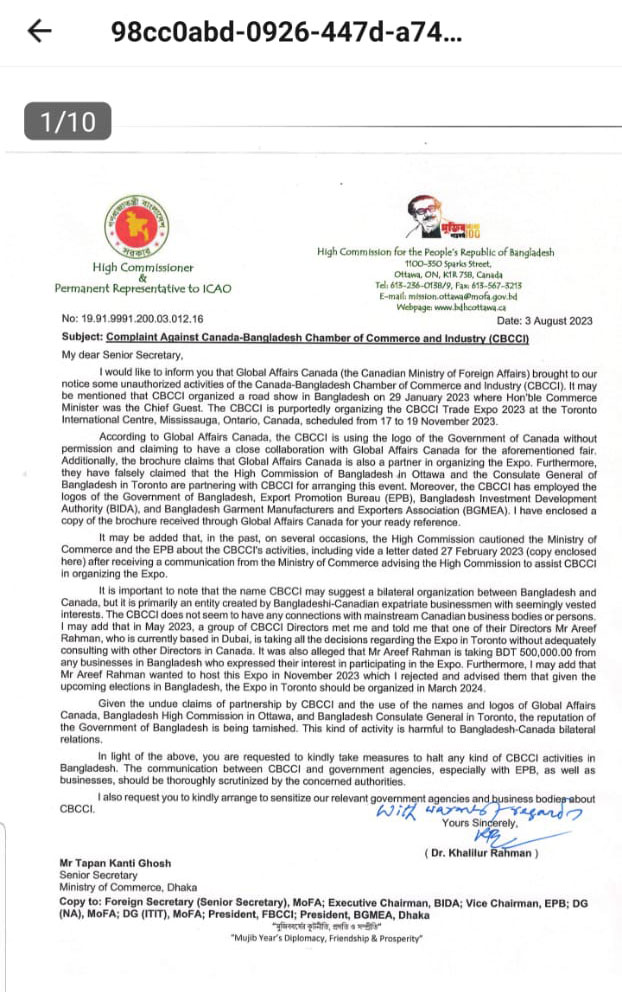 কানাডা-বাংলাদেশের বানিজ্যের কোনো খবরাখবর অথবা কোনো উদ্যোগের খবর তার কাছ থেকে পাওয়া যায় না। অথচ কানাডা-বাংলাদেশ চেম্বার অব কমার্সের উদ্যোগে আয়োজিত আসন্ন ট্রেডফেয়ার ২০২৩ বন্ধ করার জন্য তিনি উঠে পড়ে লেগেছেন। সম্প্রতি তার স্বাক্ষর করা একটি চিঠি ‘দেশে বিদেশে’র হস্তগত হয়েছে যেটা তিনি বাংলাদেশের বিভিন্ন মন্ত্রণালয়ে প্রেরণ করেন (চিঠির কপি সংযুক্ত)। জানা যায়, তিনি এ আয়োজন থেকে পার্সেন্টেজ এবং ব্যবসায়ী দলের সাথে তার পরিবারের কয়েকজন সদস্যকে যুক্ত করার দাবী করেছিলেন। শেষমেষ আয়োজকদের সাথে তার বনিবনা না হওয়ায় তিনি এ অপকর্মটি করেন। এ বিষয়ে জানতে চেয়ে তাকে কয়েকবার ফোন করলেও তিনি ফোন ধরেননি।