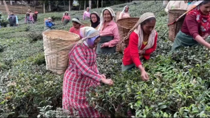 চা বাগানের শ্রমিকরা ঠিক যেভাবে পিঠে ঝুড়ি ঝুলিয়ে চা পাতা তোলেন, সেভাবেই পাতা তুলতে দেখা গেলো তাকে।