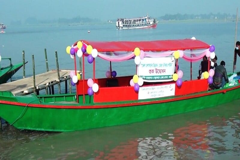 জাতীয় পতাকার আদলে সাজানো নৌকা ভাসলো পদ্মায়