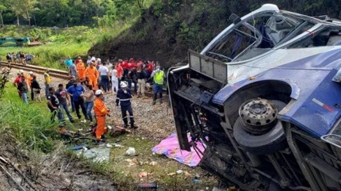 ব্রাজিলের গণমাধ্যম বিআর-১০১ মহাসড়কের পাশে পড়ে থাকা নীল ও সাদা রঙের বাসের ছবি প্রকাশ করেছে।