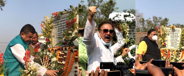 ঝাড়গ্রাম, ০৭ জানুয়ারি – বৃহস্পতিবার সাত সকালে নেতাই গ্রামের শহীদ বেদীতে শ্রদ্ধা জানালেন বিজেপি নেতা শুভেন্দু অধিকারী। বেদী ছুঁয়েছেন শুভেন্দু। তাই অপবিত্র হয়েছে শহীদ বেদী। দুপুরে সেই বেদী গঙ্গাজল ছিটিয়ে শুদ্ধ করলেন ঝাড়গ্রাম জেলা তৃণমূলের কো-অর্ডিনেটর অজিত মাহাতো ও বিনপুর-১ ব্লক তৃণমূলের সভাপতি শ্যামল মাহাতো। তারপর দুপুরে নেতাই গ্রামে এসে শহীদ বেদীতে শ্রদ্ধা জানালেন তৃণমূলের মহাসচিব পার্থ চট্টোপাধ্যায় সহ তৃণমূলের নেতা-মন্ত্রীরা। দু’টি কর্মসূচিতেই হাজির ছিলেন নেতাই-কাণ্ডে নিহত পরিবারের সদস্য ও আহতরা। ছিলেন নেতাই শহীদ স্মৃতিরক্ষা কমিটির সভাপতি দ্বারকানাথ পণ্ডা। নেতাই নিয়ে টানাপোড়েন চলছে শুভেন্দু ও তৃণমূলের মধ্যে।