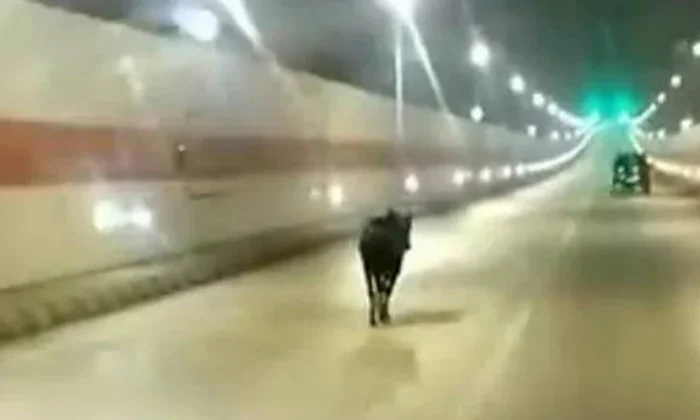 গাড়ি থেকে লাফিয়ে নেমে টানেলে দৌড়াল গরু