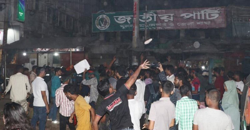 স্থানীয়রা জানান, সন্ধ্যা ৬টার দিকে বিক্ষুব্ধ ছাত্র-জনতা মিছিল সহকারে ডাকবাংলা মোড়ে আসে। এসময় ওই মিছিলে ছাত্র-জনতাকে বেশ উত্তেজিত দেখা যায়। তারা ডাকবাংলা মোড় পার হয়ে জাতীয় পার্টির খুলনা মহানগর ও জেলা কার্যালয়ের সাইনবোর্ড ভেঙে ফেলে।