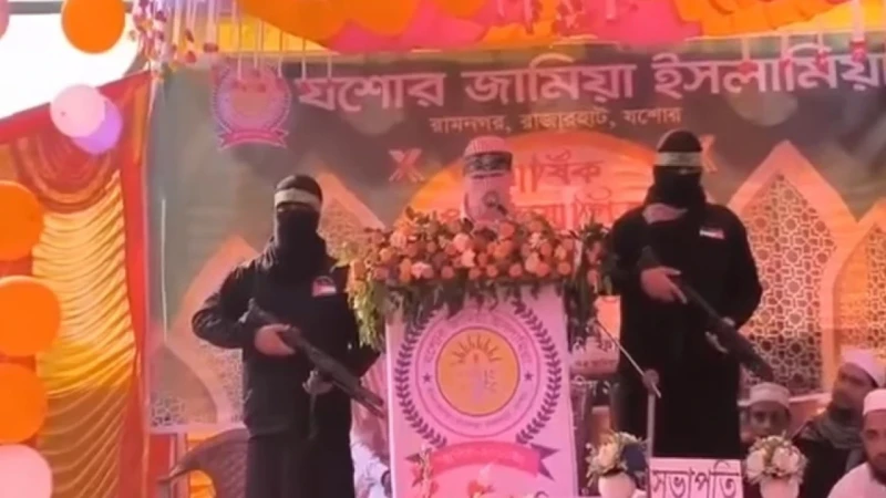 যশোর, ১৯ ডিসেম্বর – যশোর জামিয়া ইসলামিয়া মাদ্রাসার একটি ভিডিও নিয়ে ব্যাপক তোলপাড় সৃষ্টি হয়েছে। ভিডিওতে দেখা গেছে, মুখ ঢাকা একজন আরবি ভাষায় বক্তব্য দিচ্ছেন। তার পাশে দুই জন কালো কাপড়ে মুখ ঢেকে অস্ত্র হাতে গার্ডের মতো দাঁড়িয়ে আছেন।