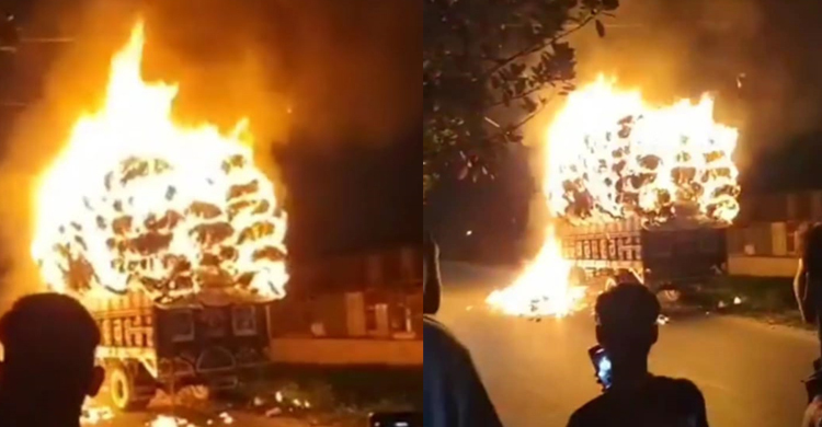 ঝুট বোঝাই চলন্ত ট্রাকে আগুন, খালে নামিয়ে চালকের প্রাণ রক্ষা