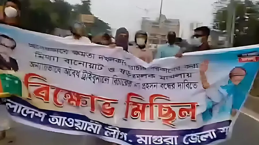 একটি ভিডিওতে জেলা আওয়ামী লীগের ব্যানারে মিছিলে অংশ নেওয়া ১৪-১৫ জন নেতাকর্মীকে ‘শেখ হাসিনা আসবে, বাংলাদেশ হাসবে’, ‘শেখ হাসিনার ভয় নাই, রাজপথ ছাড়ি নাই’-সহ বিভিন্ন স্লোগান দিতে দেখা যায়।