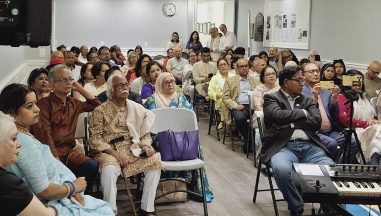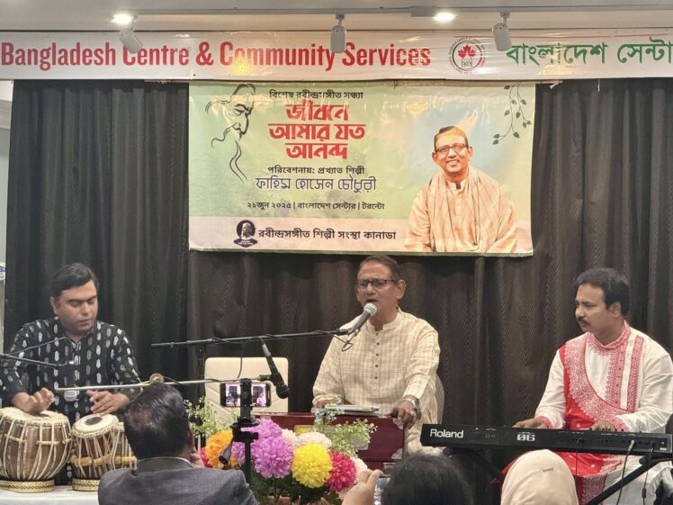 টরন্টোর বাংলাদেশ সেন্টার অডিটোরিয়ামের বাতাস যেন আজ (শনিবার)গানের সুরে কাঁপছিল। আলোর মৃদু ঝলক আর শালীন সৌন্দর্যে সাজানো মঞ্চে উঠে এলেন প্রখ্যাত রবীন্দ্রসঙ্গীত শিল্পী ফাহিম হোসেন চৌধুরী। শুরু হলো এক পরম সন্ধ্যা—যার পরতে পরতে ছিল রবীন্দ্রভাবনা, সুর, ও আত্মার গভীর অনুরণন। আয়োজনে ছিল রবীন্দ্র সঙ্গীত শিল্পী সংস্হা কানাডা।