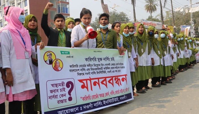 শনিবার বিকেলে নওগাঁ শহরের মুক্তির মোড়ে কেন্দ্রীয় শহীদ মিনারের সামনের সড়কে বাংলাদেশ ডিপ্লোমা নার্সিং ইনস্টিটিউট জেলা শাখার আয়োজনে প্রায় ১ঘন্টা ব্যাপী এ মানববন্ধন কর্মসূচি পালিত হয়।