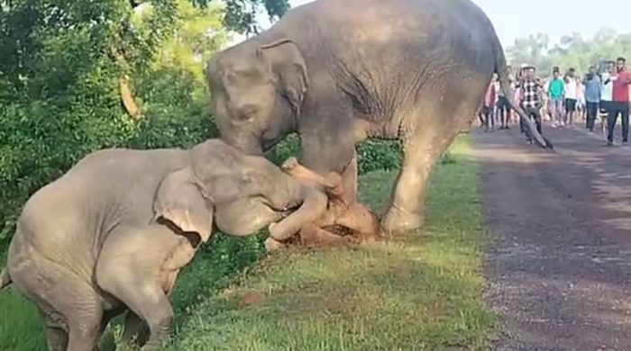স্থানীয় সূত্রে জানা গেছে, সোমবার (১ সেপ্টেম্বর) সকালে একদল হাতি ধানের জমি পেরিয়ে জঙ্গলের দিকে যাচ্ছিল। তাদের সঙ্গেই ছিল বেশ কয়েকটি শাবক। পাকা রাস্তা ও ধানজমির মাঝের উঁচু আলপথে উঠে আটকে যায় একটি হস্তীশাবক। প্রথমে মা হাতি শুঁড় দিয়ে ঠেলে তাকে তুলতে চেষ্টা করে। পরে দলের এক পূর্ণবয়স্ক হাতিও সাহায্যে এগিয়ে আসে। বেশ কিছুক্ষণ চেষ্টার পর অবশেষে সফল হয় হাতির দল। এ সময় আশপাশের গ্রামবাসী ভিড় করে ঘটনাটি দেখে এবং অনেকেই মোবাইল ফোনে ভিডিও করে রাখে।