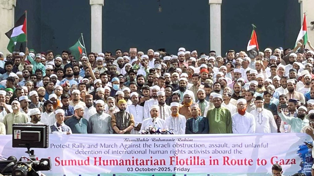 তিনি বলেন, ফিলিস্তিন ও গাজাকে আলাদা রাষ্ট্র হিসেবে স্বীকৃতি দেওয়ার পরও বিশ্বের কিছু শক্তিধর দেশ ছোট্ট ইসরায়েলের পক্ষে অস্ত্র ও সমর্থন দিয়ে এই নৃশংস ঘটনার সঙ্গে সম্পৃক্ত হচ্ছে। এই অনৈতিক সহায়তা মানবতার বিরুদ্ধে এক ধরনের খেলায় রূপ নিয়েছে। আমরা বিশ্বাস করি শহীদের রক্তের বিনিময়ে ফিলিস্তিন স্বাধীনতা অর্জন করবে ইনশাআল্লাহ। আমরা জাতিসংঘ ও আন্তর্জাতিক সম্প্রদায়কে আহ্বান জানাই— অবিলম্বে ইসরায়েলের হাতকে দমন করুন। দখল হওয়া অঞ্চলগুলো দ্রুত মুক্ত ঘোষণা করুন এবং ত্রাণবাহী জাহাজের কর্মীদের অবিলম্বে মুক্তি দিন। বাংলাদেশ সরকারের নিন্দা ও মুক্তির দাবিকেও আমরা স্বাগত জানাই। যতদিন ফিলিস্তিন স্বাধীনতা অর্জন করবে না, ততদিন মুসলমানদের লড়াই সহানুভূতি ও সংগ্রাম অব্যাহত থাকবে।