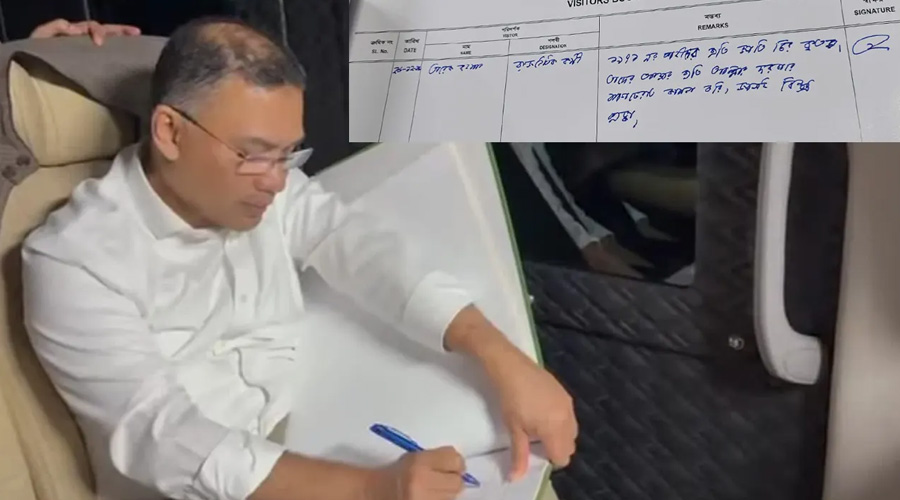 পরিদর্শন বইয়ে তারিখের জায়গায় বাংলায় ২৬-১২-২০২৫ তারিখ লেখেন। নামের স্থলে নিজের নাম তারেক রহমান লিখে পরিচয়ের স্থলে লেখেন, ‘রাজনৈতিক কর্মী’।