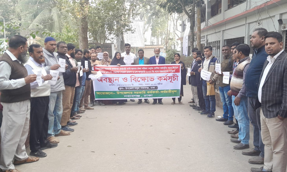 নবাবগঞ্জে নবম পে-স্কেল বাস্তবায়নের দাবিতে সরকারি কর্মচারীদের বিক্ষোভ ও অবস্থান কর্মসূচি