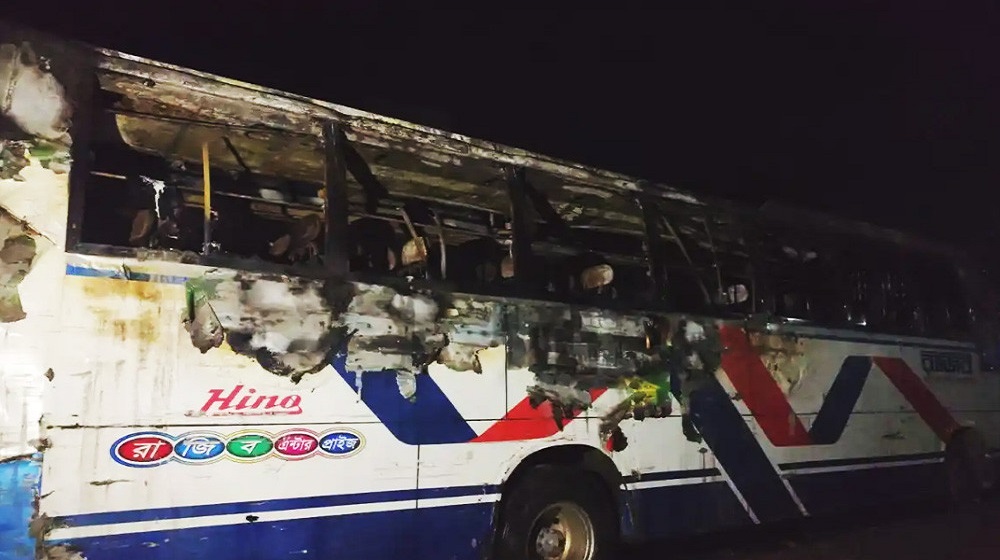 ভোটের রাতে জামালপুর পৌর বাস টার্মিনালে দাঁড়িয়ে থাকা বাসে আগুন