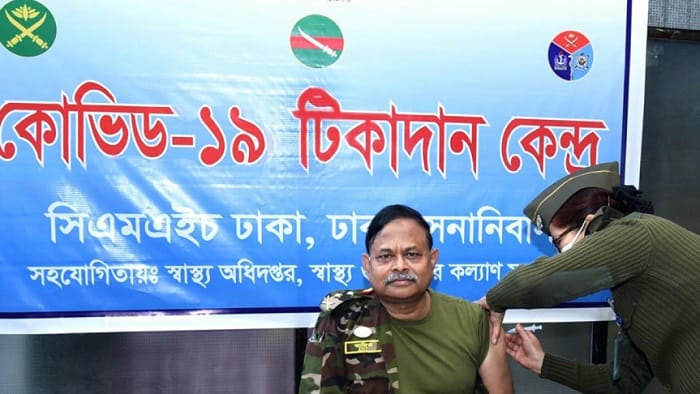 ঢাকা, ১৪ ফেব্রুয়ারি – সেনাবাহিনীর প্রধান জেনারেল আজিজ আহমেদ ঢাকার সম্মিলিত সামরিক হাসপাতালে (সিএমএইচ) করোনাভাইরাসের টিকা নিয়েছেন। টিকা নেওয়া শেষে তিনি সবাইকে কোনো প্রকার গুজবে কান না দিয়ে টিকা নেওয়ার আহ্বান জানান।