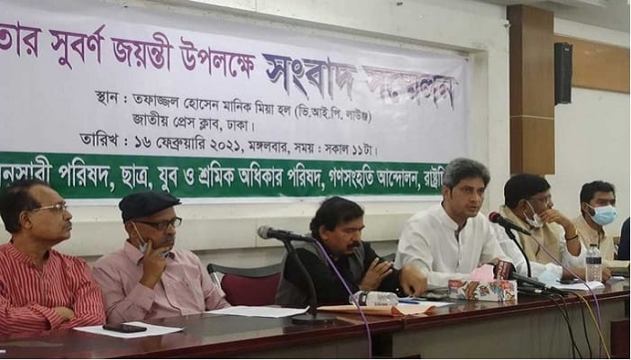 ঢাকা, ১৭ ফেব্রুয়ারি – নুরুল হক নূর নেতৃত্বাধীন ছাত্র, যুব ও শ্রমিক অধিকার পরিষদ, জোনায়েদ সাকি নেতৃত্বাধীন গণসংহতি আন্দোলন, ডা. জাফরুল্লাহ চৌধুরী নেতৃত্বাধীন ভাসানী অনুসারী পরিষদ ও রাষ্ট্রচিন্তা-এই চার সংগঠন মিলে স্বাধীনতার সুবর্ণজয়ন্তী উদযাপনের কর্মসূচি দিয়েছে।