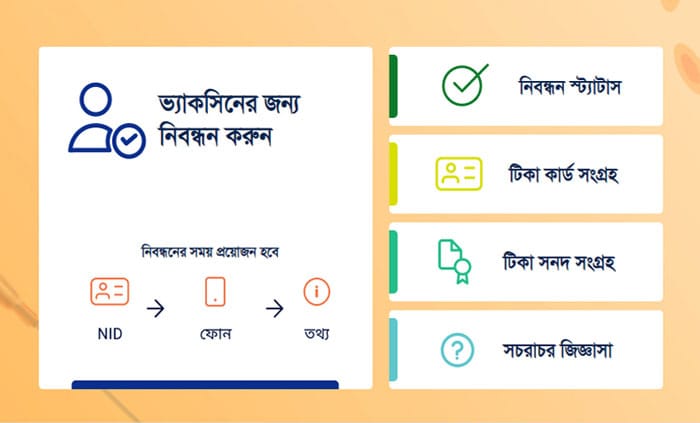 ইংরেজিতে সুরক্ষা ডট গভ ডট বিডি (www.surokkha.gov.bd) নামে নির্দিষ্ট ওয়েব সাইটে গিয়ে নিবন্ধন করতে হয়। নিবন্ধনের পরিচয় যাচাইয়ের প্রথমেই লেখা আছে নাগরিক নিবন্ধন (৪০ বছর ও তদুর্ধ)। এরপর লেখা আছে, স্বাস্থ্য ও পরিবার কল্যাণ মন্ত্রণালয় এর সকল কর্মকর্তা-কর্মচারি, অনুমোদিত বেসরকারি ও প্রাইভেট স্বাস্থ্য স্বাস্থ্য ও পরিবার পরিকল্পনা কর্মকর্তা-কর্মচারি, প্রত্যক্ষভাবে সম্পৃক্ত সকল সরকারি ও বেসরকারি স্বাস্থ্য সেবা কর্মকর্তা-কর্মচারি, বীরমুক্তিযোদ্ধা ও বীরাঙ্গনা, সম্মুখসারির আইনশৃংখলা বাহিনী, সামরিক বাহিনী, রাষ্ট্র পরিচালনার নিমিত অপরিহার্য কার্যালয়, সম্মুখ সারির গণমাধ্যমকর্মী, নির্বাচিত জনপ্রতিনিধি, সিটি কর্পোরেশন ও পৌরসভার সম্মুখ সারির কর্মকর্তা-কর্মচারি, ধর্মীয় প্রতিনিধি (সকল ধর্মের), মৃতদেহ সৎকার কার্যে নিয়োজিত ব্যক্তি, জরুরি বিদ্যুৎ, পানি গ্যাস, পয়নিষ্কাশন ও ফায়ার সার্ভিস এর সম্মুখ সারির সরকারি কর্মকর্তা-কর্মচারি, রেলস্টেশন, বিমানবন্দর ও নৌ বন্দরের সরকারি কর্মকর্তা-কর্মচারি, জেলা ও উপজেলাসমূহে জরুরি জনসেবায় সম্পৃক্ত সরকারি কর্মকর্তা-কর্মচারি, ব্যাঙ্ক কর্মকর্তা-কর্মচারি, প্রবাসী অদক্ষ শ্রমিক, জাতীয় দলের খেলোয়াড়।