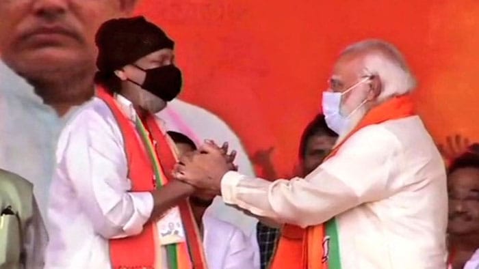 কলকাতা, ০৭ মার্চ – শনিবার পর্যন্ত ছিলেন ‘গ্রিনরুম’-এ। রবিবার প্রধানমন্ত্রী নরেন্দ্র মোদীর ব্রিগেড মঞ্চে ধুতি-পাঞ্জাবিতে ‘বাঙালিবাবু’ হয়েই আবির্ভূত হলেন মিঠুন চক্রবর্তী। মঞ্চে উঠে নিজের ছায়াছবির নাটকীয় সংলাপকে তুলে ধরলেন ভোটে বিজেপি-র নতুন স্লোগান হিসাবে। বললেন, ‘আমি জলঢোড়াও নই, বেলেবোড়াও নই। আমি জাত গোখরো, এক ছোবলে ছবি।’