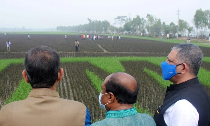 বগুড়া, ১০ মার্চ – ধানখেতে ফুটিয়ে তোলা ‘শস্যচিত্রে বঙ্গবন্ধু’ পরিদর্শন করেছেন গিনেস ওয়ার্ল্ড রেকর্ডসের প্রতিনিধিদল। মঙ্গলবার বগুড়ার শেরপুর উপজেলায় ১০০ বিঘা আয়তনের এ ধানখেত পরিদর্শন শেষে প্রতিনিধিদলের সদস্যরা জানিয়েছেন, শস্যখেতের বিশাল ‘ক্যানভাসে’ ফুটিয়ে তোলা জাতির জনক বঙ্গবন্ধু শেখ মুজিবুর রহমানের নান্দনিক প্রতিকৃতিটি বিশ্ব রেকর্ড গড়তে যাচ্ছে। সবকিছু ঠিকঠাক থাকলে আগামী এক সপ্তাহের মধ্যে গিনেস ওয়ার্ল্ড রেকর্ডসের স্বীকৃতি মিলবে।
