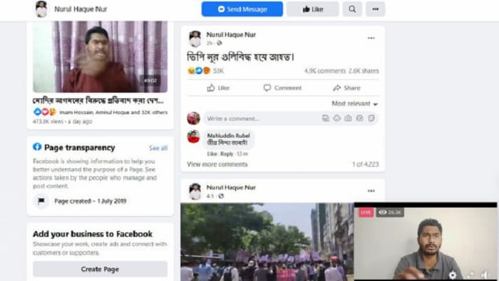 বিক্ষোভ মিছিল ও সংঘর্ষের ঘটনার পর দুপুর ১২টা ৫৪ মিনিটে সামাজিক যোগাযোগমাধ্যম ফেসবুকে ‘Nurul Haque Nur’ নামের একটি পেজ থেকে ‘ভিপি নুর গুলিবিদ্ধ হয়ে আহত’ উল্লেখ করে একটি স্ট্যাটাস দেওয়া হয়। এর ঠিক দুই ঘণ্টা ২৬ মিনিট পর অর্থাৎ বিকেল ৩টা ২০ মিনিটে একই ফেসবুক পেজ থেকে নুরুল হক নুর লাইভে আসেন।