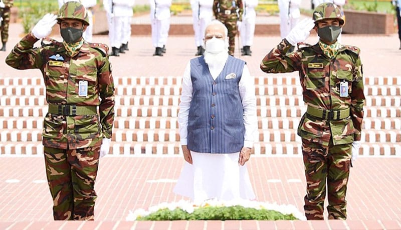 জাতির পিতা বঙ্গবন্ধু শেখ মুজিবুর রহমানের জন্মশতবার্ষিকী ও স্বাধীনতার সুবর্ণজয়ন্তী উদযাপন অনুষ্ঠানে যোগ দিতে শুক্রবার সকালে ঢাকা পৌঁছান ভারতের প্রধানমন্ত্রী নরেন্দ্র মোদি। তাকে বহনকারী বিমানটি সকাল সাড়ে ১০টায় ঢাকার হজরত শাহজালাল আন্তর্জাতিক বিমানবন্দরে অবতরণ করে। এ সময় বাংলাদেশের প্রধানমন্ত্রী শেখ হাসিনা তাকে ফুল হাতে স্বাগত জানান। তাকে লালগালিচা সংবর্ধনা দেওয়া হয়। দেওয়া হয় গার্ড অব অনার। বিমানবন্দরের আনুষ্ঠানিকতা শেষে মোদি জাতীয় স্মৃতিসৌধে যান। দুপুর ১২টার দিকে তিনি স্মৃতিসৌধের বেদিতে ফুল দিয়ে বীর শহীদদের প্রতি শ্রদ্ধা জানান।