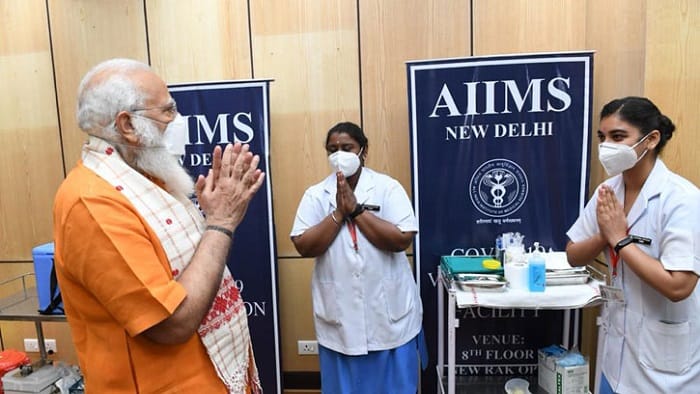 টুইটবার্তায় মোদি বলেন, ‘আজ এইমসে কোভিড-১৯ টিকার দ্বিতীয় ডোজ নিলাম। ভাইরাসকে হারানোর যে হাতেগোনা কয়েকটি উপায় আছে, তার অন্যতম হলো টিকাকরণ। আপনি যদি টিকা পাওয়ার যোগ্য হন, তাহলে ডোজ নিন। কো-উইনে রেজিস্ট্রার করে টিকা নিন।’