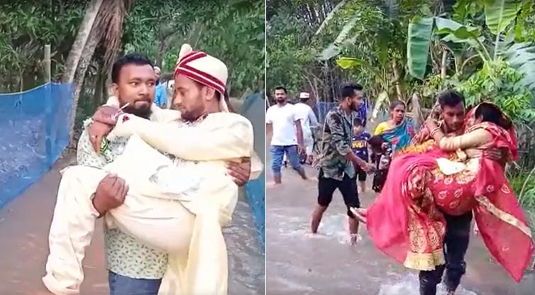 দুর্যোগপূর্ণ আবহাওয়ায় বিয়ে, কোলে করে বর-কনেকে রাস্তা পার