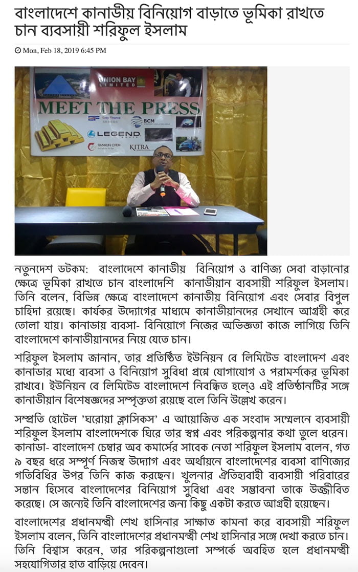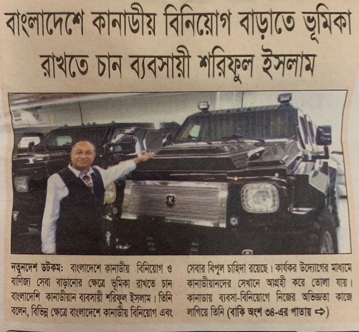 সংবাদের শিরোনাম: ”বাংলাদেশে কানাডীয় বিনিয়োগ বাড়াতে ভূমিকা রাখতে চান ব্যবসায়ী শরিফুল ইসলাম”।