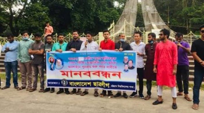 রোববার দুপুরে বিশ্ববিদ্যালয়ের শহীদ মিনারের সামনে মানববন্ধন করে এ দাবি জানান তারা। মানববন্ধন শেষে ছাত্রলীগ নেতৃবৃন্দ বিশ্ববিদ্যালয় প্রক্টর বরাবর স্মারকলিপি দেন।