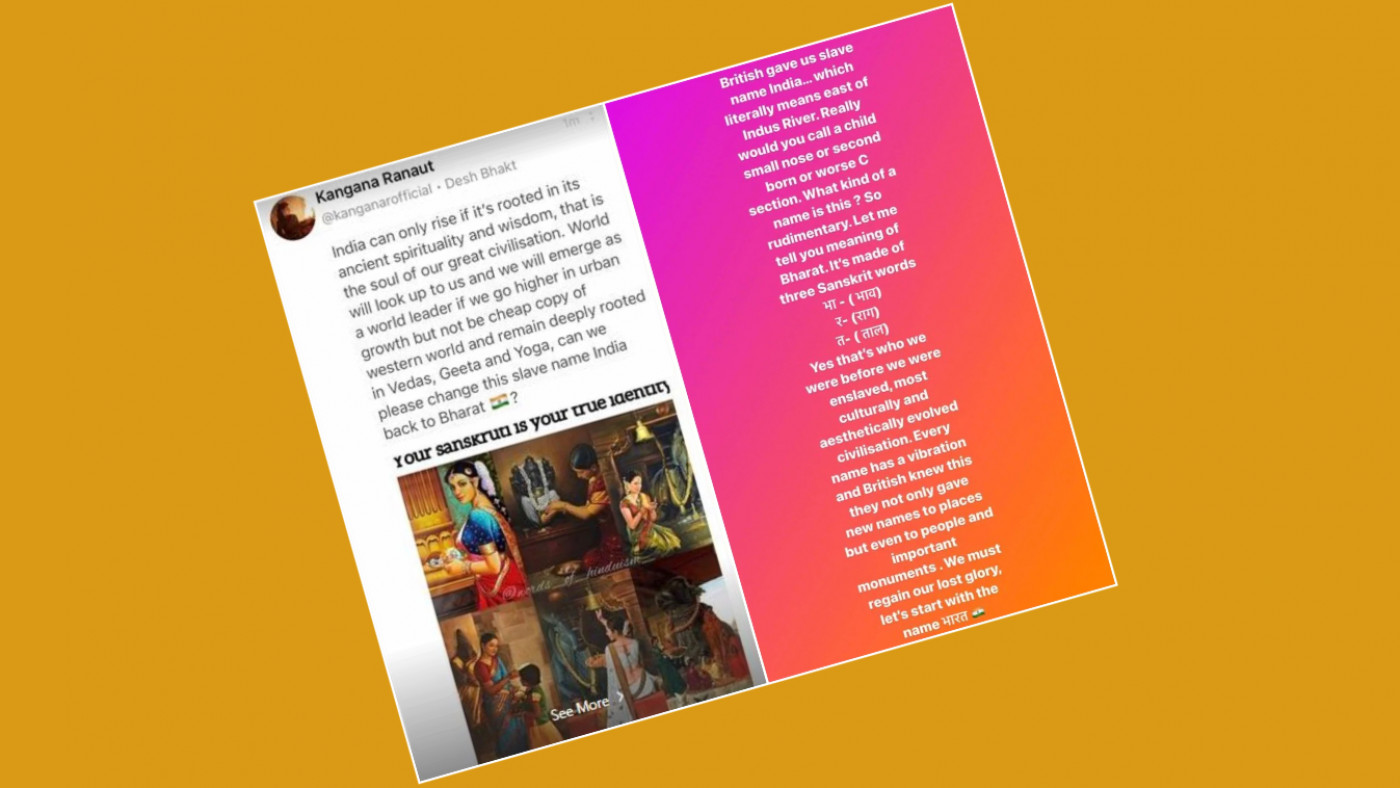 কঙ্গনার মতে, ব্রিটিশেরা ‘ইন্ডিয়া’ নাম দিয়েছে। তিনি ‘ভারত’ (Bharat) নামের পক্ষে যুক্তি তুলে ধরে বলেছেন, এটি সংস্কৃত শব্দ। ব্যাখ্যা করে তিনি লেখেন, বিএইচ (ভব), আরএ (রাগ) ও টিএ (তাল)। ভারত নামের সঙ্গে সভ্যতা ও সংস্কৃতি জড়িত। এ নাম দেওয়া হলে তাঁর দেশ অতীত গৌরব ফিরে পাবে। সেইসঙ্গে তিনি ভক্তদের ভারত নাম বলার আহ্বানও জানান।
