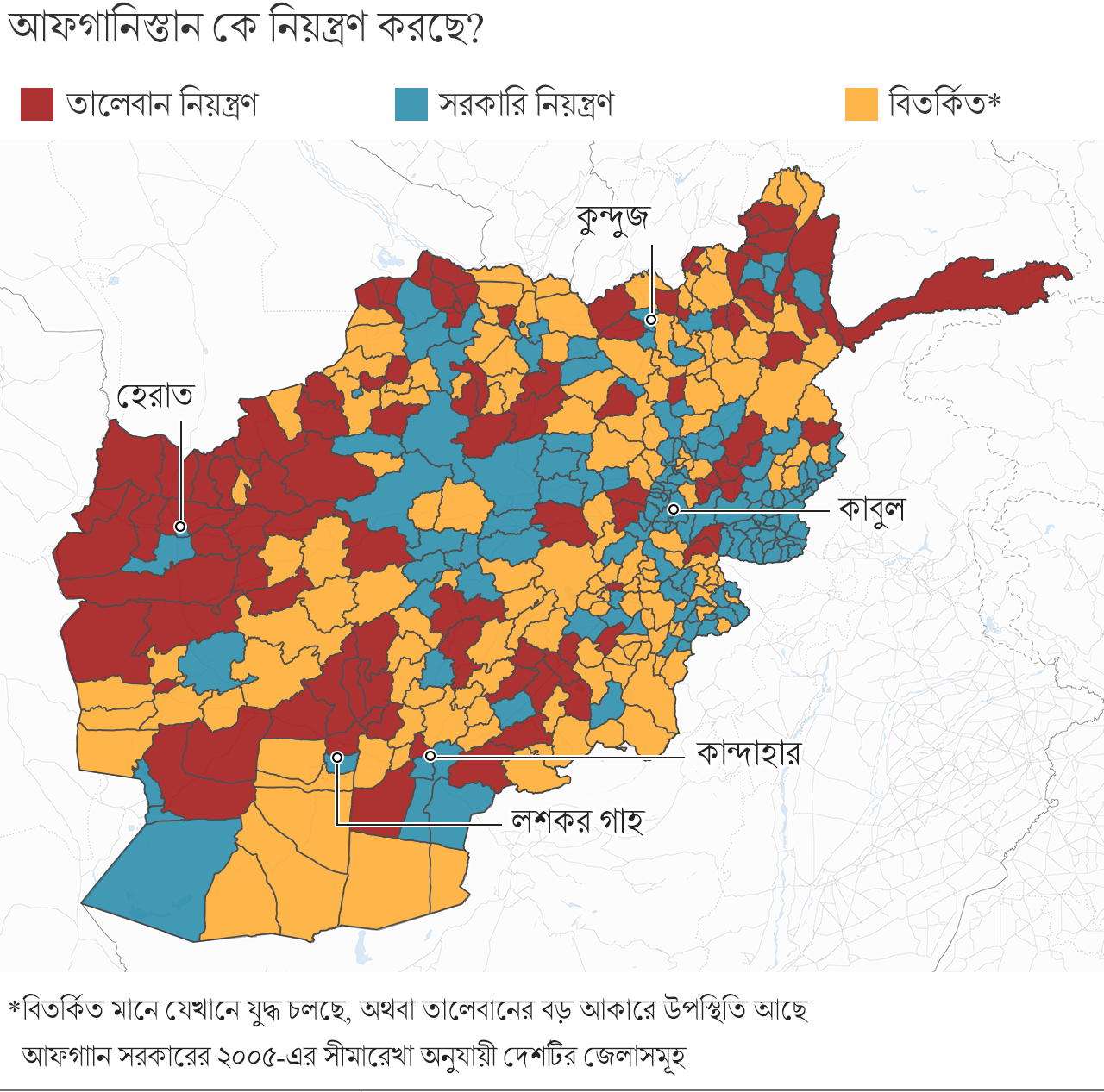 এই মানচিত্রে যে এলাকাগুলোর নিয়ন্ত্রণ কার হাতে তা নিয়ে বিতর্ক আছে বলে দেখানো হয়েছে – সেগুলোতে হয় যুদ্ধ চলছে, নতুবা জেলাটির কিছু অংশে তালেবানের জোরদার উপস্থিতি রয়েছে।