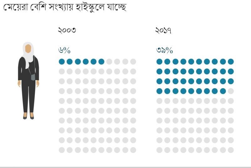 দু’হাজার তিন সাল নাগাদ ২৪ লক্ষ মেয়ে স্কুলে যাচ্ছিল। এখন দেশটিতে স্কুলে যাচ্ছে এমন মেয়ের সংখ্যা প্রায় ৩৫ লক্ষ। তা ছাড়া সরকারি ও বেসরকারি বিশ্ববিদ্যালয়গুলোতে শিক্ষার্থীদের এক-তৃতীয়াংশই মেয়ে।