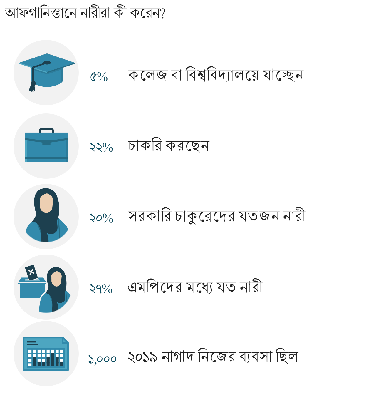 দু’হাজার উনিশ সাল নাগাদ এক হাজারেরও বেশি আফগান নারী তাদের নিজস্ব ব্যবসা শুরু করেছেন – যা তালেবান শাসন কায়েম থাকলে নিষিদ্ধ হতো।