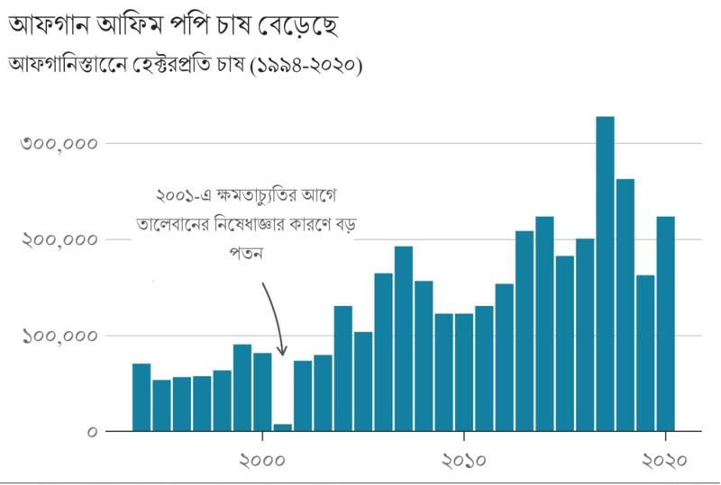 যদিও তালেবান ২০০১ সালে পপি চাষের ওপর কিছুকালের জন্য নিষেধাজ্ঞা আরোপ করেছিল – কিন্তু এটা এখন তাদের জন্য (এবং অন্যদের জন্যও) কোটি কোটি ডলারের ব্যবসায় পরিণত হয়েছে।