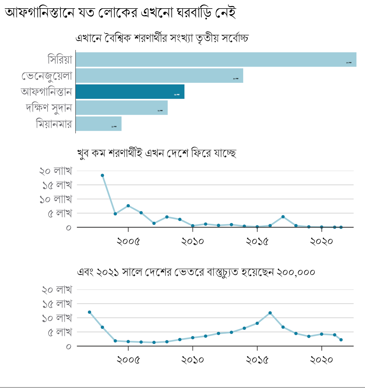 গত বছর লড়াইয়ের কারণে বাস্তুচ্যুত হন চার লক্ষেরও বেশি লোক। তা ছাড়া ২০১২ সাল থেকে এ পর্যন্ত আফগানিস্তান ছেড়ে পালিয়েছেন প্রায় ৫০ লক্ষ লোক – এবং তারা দেশে ফিরতে পারেননি। জাতিসংঘের মানবাধিকার সংস্থার তথ্য অনুযায়ী, পৃথিবীতে যে দেশগুলোতে বাস্তুচ্যুত লোকের সংখ্যা সবচেয়ে বেশি – তাদের মধ্যে আফগানিস্তান হচ্ছে তৃতীয়।
