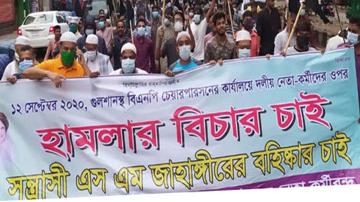 ব্যানারে লেখা ছিল, ১২ সেপ্টেম্বর গুলশানস্থ বিএনপি চেয়ারপারসনের কার্যালয়ে দলীয় নেতা-কর্মীদের ওপর হামলার বিচার চাই এসএম জাহাঙ্গীরের বহিস্কার চাই।