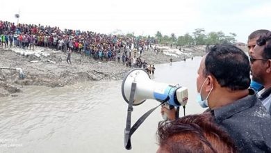 কাফনের কাপড় পরে টেকসই বেড়িবাঁধ নির্মাণের দাবিতে মানববন্ধন